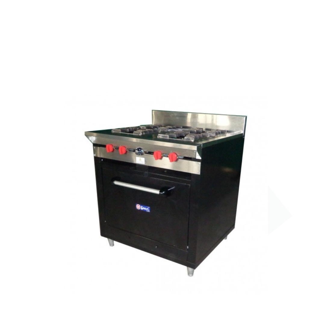 Descripción: Cocina a gas elaborada en acero inoxidable 304-4, compuesta por 4 hornillas de hierro fundido con horno Diseñada para ser utilizada en cocinas de restaurantes, hoteles, casinos y otros lugares que se relacionen con la cocción.